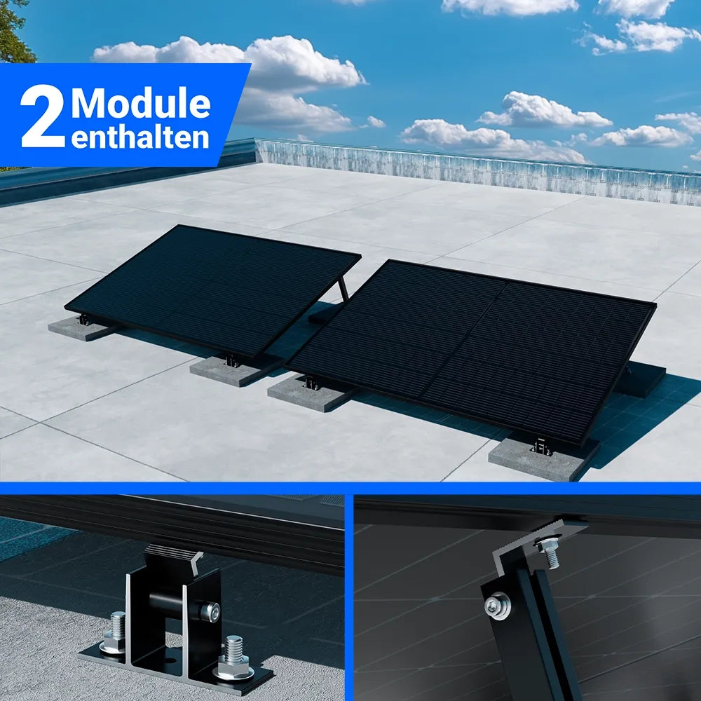 Zwei Haken und zwei verstellbare Stützen pro Modul mit Neigungswinkel (10–30°) – alle Schrauben im Set enthalten. -