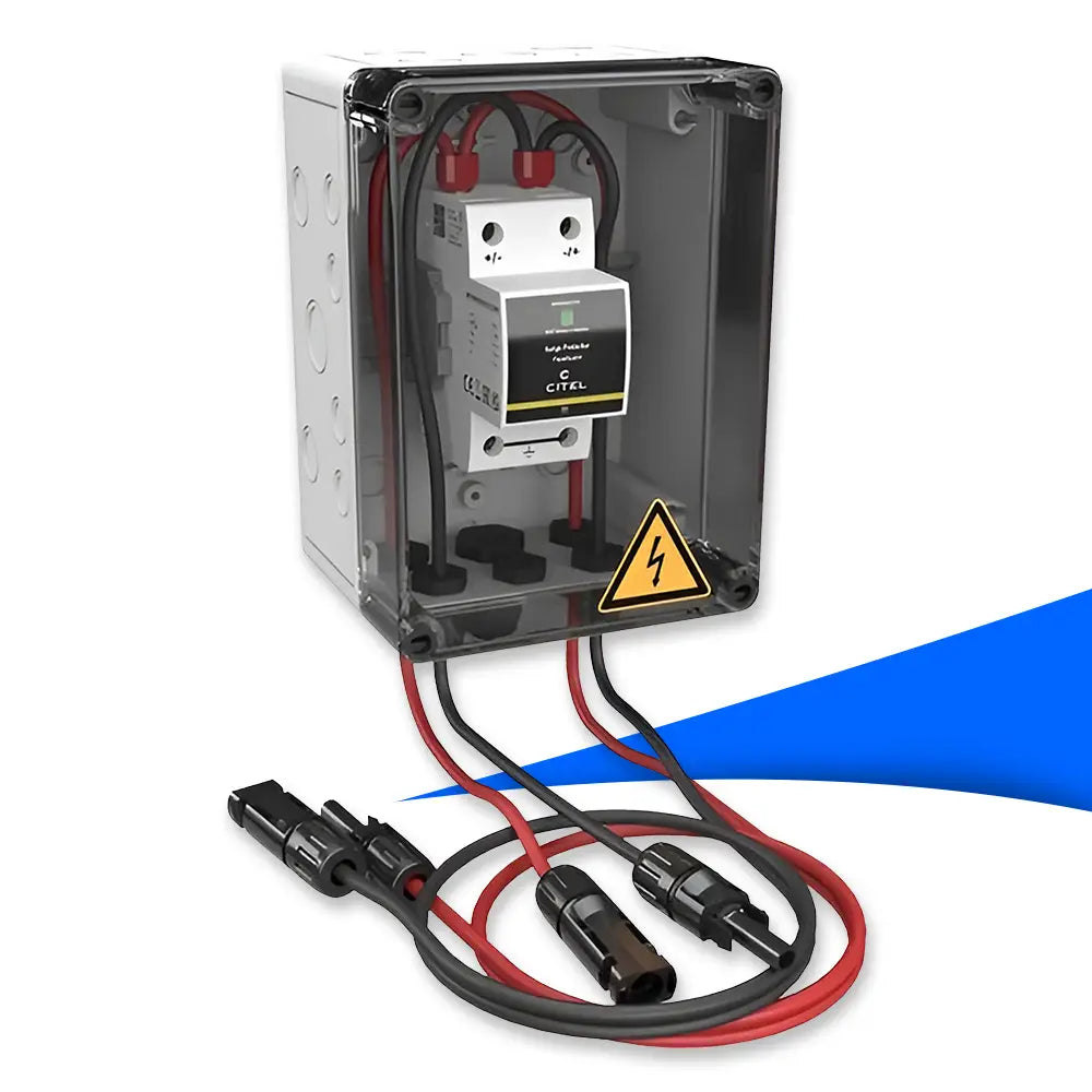 Der Citel CiPlug1-DP6-1-XS ist die perfekte Wahl für PV-Installationen, die einen zuverlässigen Überspannungsschutz benötigen. Mit MC4-Steckern für eine einfache Plug-and-Play-Installation und einem robusten, wetterfesten Gehäuse ist dieser Generatoranschlusskasten eine langlebige Lösung für Solaranlagen.