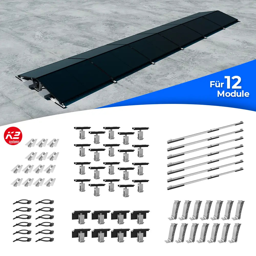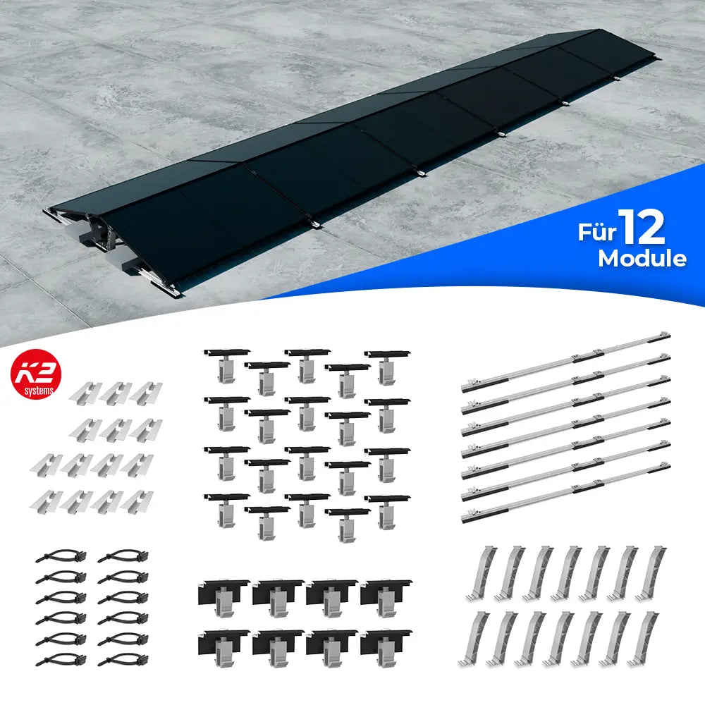 Das D-Dome 6.10 Base Set L von K2 Systems bietet eine optimale Lösung für Ost-West-ausgerichtete Solaranlagen auf Flachdächern. Mit einer Kompatibilität für Modulbreiten zwischen 1061 und 1170 mm sorgt es für eine effiziente Dachflächennutzung. Die vormontierten Komponenten, darunter die Basisschiene, Mat S und MidPlate, gewährleisten eine zügige und unkomplizierte Installation.