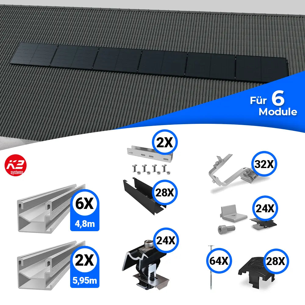 Mit robusten Dachhaken, langlebigen Aluminiumprofilen und schwarzen Modulklemmen sorgt das Set für eine stabile und optisch ansprechende Befestigung. Geeignet für Schrägdächer mit Ziegel/Pfanneneindeckung, ermöglicht es eine einfache und sichere Montage deiner Photovoltaikanlage.